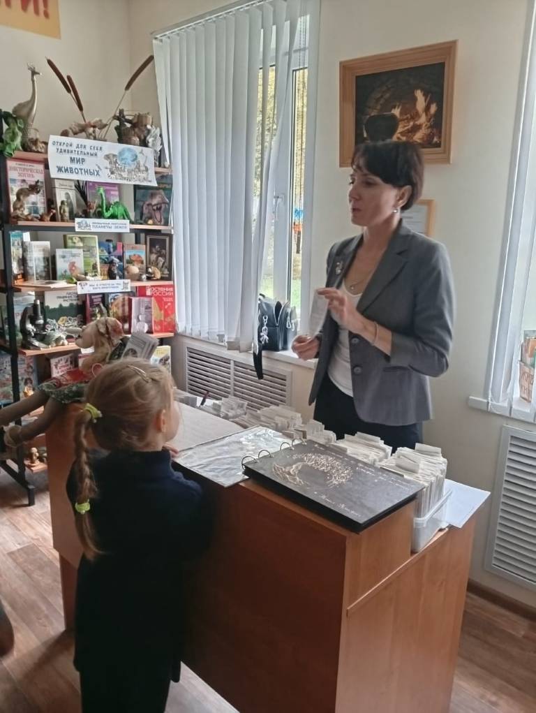 Первоклассники познакомились с библиотекой (абонементом и читальным залом), с правилами пользования и оформлением записи в библиотеку. Заведующая провела викторину о книгах и интересную экскурсию на волшебном паровозике. В читальном зале библиотекарь провела экскурсию и познакомила с книжными выставками. Для ребят подготовили первые для них энциклопедии и рассказали о значимости такой литературы для них. Далее для детей прошла увлекательная игра «Угадай животное». В конце мероприятия сотрудники библиотеки посвятили ребятишек в читатели, выдали им удостоверения, звёздочки-медальки и подарили шары. Но дети тоже пришли со своими подарками и вручили библиотеке свои рисунки.