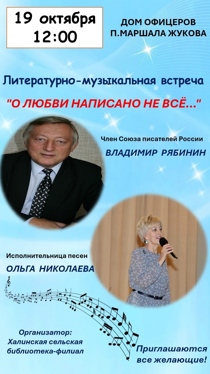 Дорогие друзья! 19 октября 2025 года в 12:00 в Доме офицеров п.Маршала Жукова состоится Литературно-музыкальная встреча "О любви написано не всё...". Гости встречи: член Союза писателей России Владимир Рябинин и исполнительница песен Ольга Николаева. Владимир Николаевич познакомит присутствующих со своим творчеством, прочитает стихи о любви к Родине, к женщине. Ольга Михайловна исполнит песни на стихи поэта. Приглашаются все желающие, вход свободный! Организатор встречи: Халинская сельская библиотека-филиал.